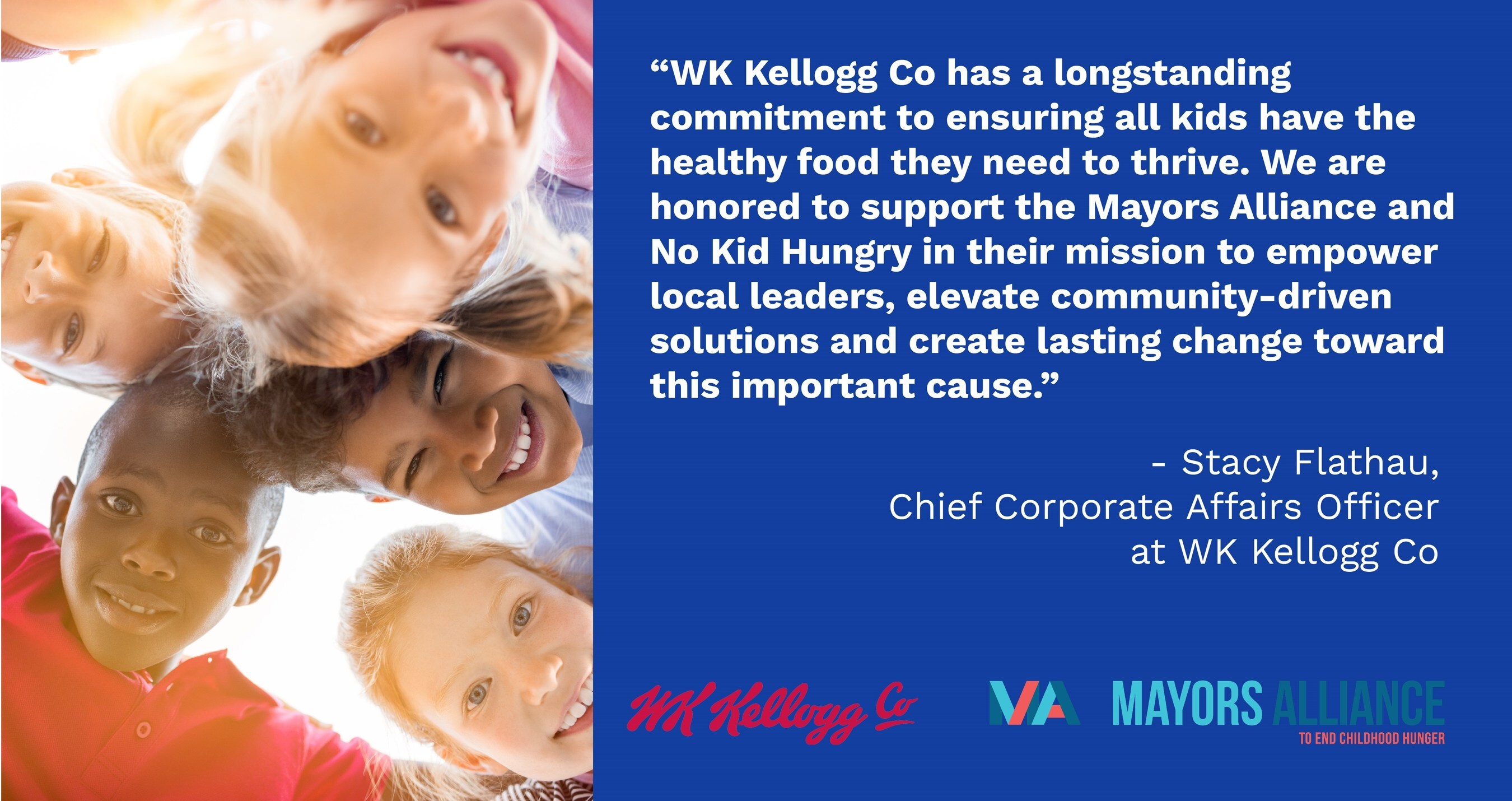 "WK Kellogg Co has a longstanding commitment to ensuring all kids have the healthy food they need to thrive," said Stacy Flathau, Chief Corporate Affairs Officer at WK Kellogg Co. "We are honored to support the Mayors Alliance and No Kid Hungry in their mission to empower local leaders, elevate community-driven solutions and create lasting change toward this important cause."
